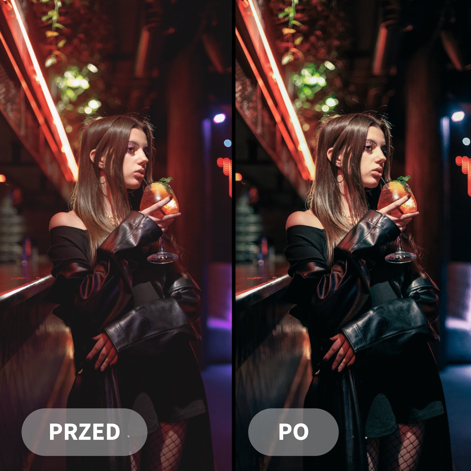 Różne warianty presetów pozwalają dopasować efekt do nocnych ulic, wnętrz o słabym oświetleniu lub scen z delikatnym światłem punktowym. Subtelny filmowy grain dodaje zdjęciom naturalnej głębi i artystycznego charakteru.